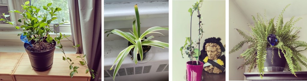 I fuss over my plants. Jasmine flourishes in the strong afternoon sun of the living room. Ivy and Spider sit at the library window in the next room. Spider is still adjusting to his new surroundings with the enthusiasm of an adolescent. I heard spider plants are tremendous survivors — so far, he’s alive, but sullen. What sort of music do spiders like? Heavy metal? However, that would disturb his roommate, Ivy.